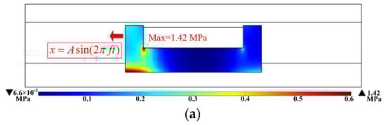 In the simulation of the structural stress field under the action of the magneto–fluid field, the piston head is the core component of the MR damper and can be regarded as a small dynamic deformation body when the damper is working. In the simulation, the force of the structure other than the piston head was not considered. The properties of the piston head area are set to linear elasticity, and its Young’s modulus, poisson’s ratio, and density are all derived from the materials in the library. At the same time, the displacement equation of the piston head subjected to sinusoidal excitation is specified by the dynamic mesh as x = Asin(2πft), and the boundary load on the piston head is defined as the pressure, p, of the MR fluid. The fluid–solid coupling boundary is boundary 1, shown in Figure 6. When the amplitude of the sinusoidal reciprocating movement of the piston head, A, was 10 mm and the frequency, f, was 1 Hz, the stress distribution of the piston head under different excitation currents is shown in Figure 14. Because the velocity of the sinusoidal motion at the initial position is the largest in the entire period, the figure only shows the stress distribution of the piston head at the initial position under different currents.