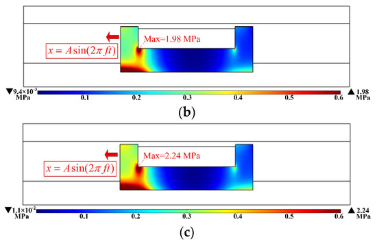 Stress distribution under different currents of the MR damper. (a) Current of 0.6 A, (b) current of 1 A, (c) current of 1.4 A.