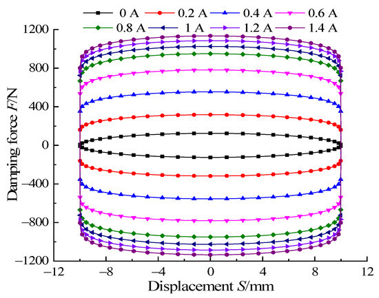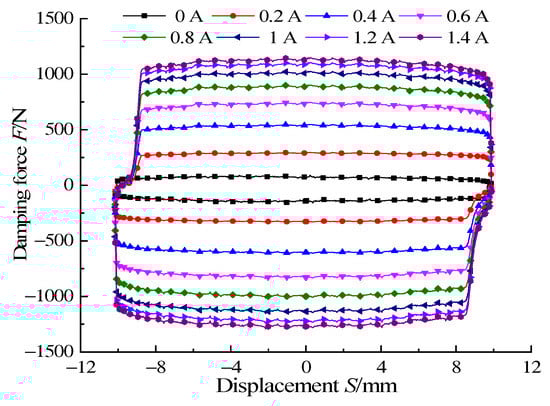 The sum of the reaction forces of the MR fluid on the piston head is the output damping force of the damper. When the piston head is subjected to a sinusoidal excitation with an amplitude, A, of 10 mm and frequency, f, of 1 Hz, by solving the total reaction force globally, the variation curve of the damper output damping force with displacement under different excitation currents can be obtained, as shown in Figure 15. It can be seen from the figure that the output damping force changes little with the displacement, and its distribution is symmetrical about the relative equilibrium position. However, by comparing the damping force versus displacement curves for each current, it can be seen that the output damping force of the damper will increase with the increase in the excitation current. The main reason is that the increase of the current will increase the magnetic flux density in the damping gap. The total reaction force of the MR fluid on the piston head can be divided into two parts: magnetically induced and viscosity-induced damping force. The increase in the magnetic field will increase the magnetic damping force, making output damping force larger. At the same time, due to the magnetic saturation of the damper, the output damping force increase becomes lower with the increase in current when the current reaches 1 A. The output damping force and dynamic range of the MR damper are the main indices to evaluate its dynamic performance. The ratio of the output damping force to the viscosity-induced damping force is the dynamic range of the proposed damper. The dynamic range is 1 when the current is 0 A. There is only viscous damping force in the damper, and its magnitude is 124.8 N. When the current is 1.4 A, the output damping force of the damper is up to 1134.6 N and the dynamic range is up to 9.1. The simulation results show that the proposed damper can output appropriate damping force and has a wide adjustment range of damping force, which meets the requirements of an automobile shock absorber.