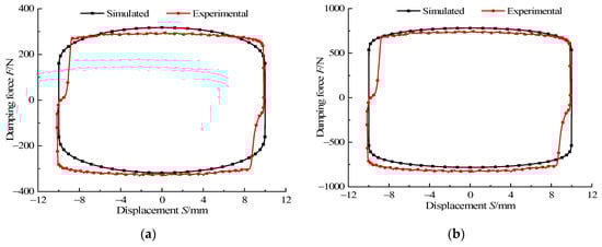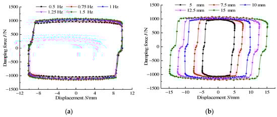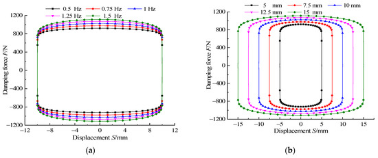 To study the influence of different vibration excitations on the output damping force of the damper, keeping the current constant at 1 A, sinusoidal excitations of different frequencies and amplitudes for the piston head, and the dynamic simulation results are shown in Figure 16. Figure 16a is the relationship curve of output damping force with displacement at different frequencies when the amplitude is 10 mm. Figure 16b is the relationship curve of output damping force with displacement under different amplitudes when the frequency is 1 Hz. At the same amplitude, the output damping force increased slightly with an increase in the frequency; and at constant frequency, the output damping force increased slightly with an increase in amplitude. The main reason is that when a certain excitation current was given, the proposed damper has both viscous and magnetically induced damping forces under the action of the magnetic field. The magnetically induced damping force is only related to the excitation current, and the current does not change, therefore, the magnetically induced damping force is constant. The viscosity-induced damping force is related to the flow velocity of the MR fluid; the faster the velocity, the greater the viscous damping force. As the excitation frequency and amplitude of the piston head increase, the flow velocity of the MR fluid in the damper will increase, increasing the viscosity-induced damping force, and the viscosity-induced damping force accounts for a smaller proportion of the total damping force. Therefore, the output damping force of the damper will increase slightly with frequency and amplitude.