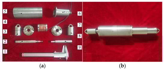 Prototype of MR damper. (a) Components: (1) left piston rod, (2) left lifting lug, (3) left end cover, (4) piston head, (5) cylinder, (6) end shield, (7) right end cover, (8) right lifting lug, (9) right piston rod. (b) the prototype.