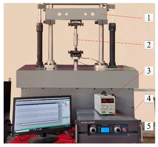 Dynamic performance test rig. (1) Vibration excitation platform, (2) MR damper, (3) DC power, (4) electro-hydraulic servo controller, (5) computer.