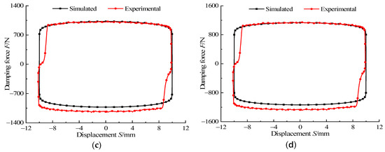 To verify the accuracy of the multiphysics coupling simulation, we compared the output damping force simulation values and the experimental values of the designed damper at applied currents of 0.2 A, 0.6 A, 1 A, and 1.4 A, and the results are shown in Figure 21. The damping force to displacement relationship measured in the experiment has the same variation law as that in the simulation, but the curves obtained in the experiment are not completely in the regular square distribution as in the simulation. There are different degrees of deformations at the maximum strokes of stretching and compression. The main reason lies in the fact that the MR fluid in the damper was not completely perfused during the experiment, resulting in a certain volume of air mixed into the chamber, which caused a small segment of empty path in the process of tension and compression of the damper due to the inability to compensate for the missing liquid in the chamber in time. Therefore, the displacement curves of damping force are somewhat missing. Comparing the simulation values of the output damping force with the experimental values shows that the output damping force obtained by the simulation can approximate the experiment under different currents. The comparison result verifies the accuracy of the multiphysics coupling simulation.