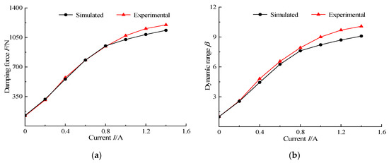 When the current was 1.4 A, the damping force and dynamic range of simulation were 1134.6 N and 9.1, respectively. The damping force and dynamic range of the experimental damper were 1200.0 N and 10.1, respectively. The damping force error between the simulation and the experiment was only 5.5%, and the dynamic range error between the simulation and the experiment was only 9.9%. By comparing simulation and experimental results and error analysis, the accuracy of the multiphysics coupling simulation in this paper was further verified.