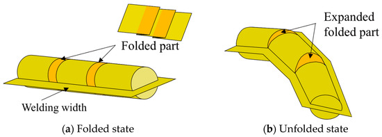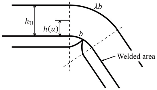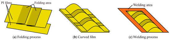 In the bellow structure, the longitudinal cross-sectional view of the curved state with air pressure applied is shown in Figure 4. The folded length at the point where the two films are welded together (welded area) is b and the length after the bellows expansion is . The lengths of the upper and lower films must be similar in the unmold; therefore, . The height from the welded area was and the height at the top of the shape was .
