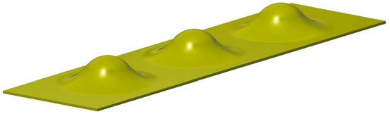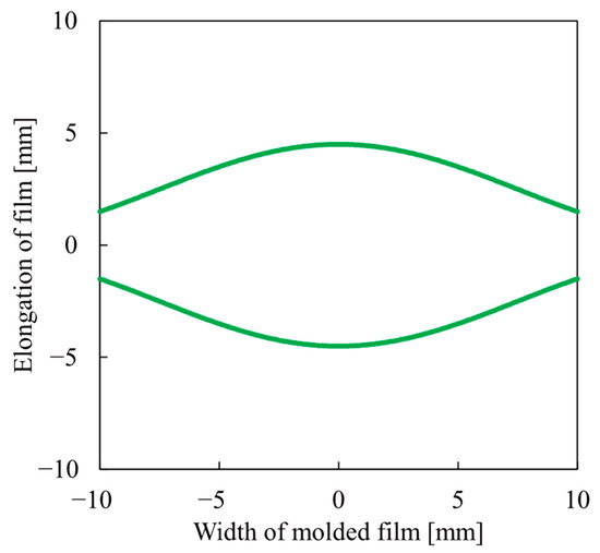 The required elongation of the film was calculated based on the obtained design equation and a molding shape was designed. A molded shape in the direction of elongation is shown in Figure 6. The center of the shape was set as a zero point. Each parameter was set to the values listed in Table 1 to achieve a bending angle of 36°. A mold for the pod structure was fabricated based on the elongation.