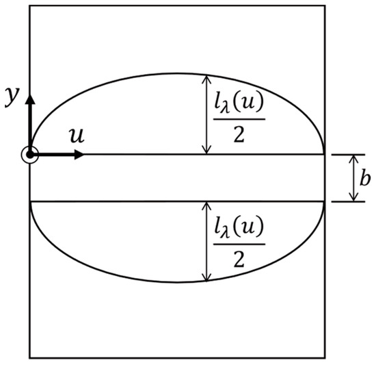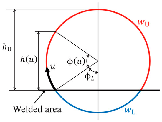 The cross-section of the curved state with pneumatic pressure applied is shown in Figure 5. Due to the difference in width between the upper and lower films, the former covers a larger part of the circumference. The width of the upper film is , the width of the lower film is , the radius of the actuator is r, and the angle between the welded area and the bottom is . The angle between the welded area and a point of the circumference of the circle with height is given by the following equation.