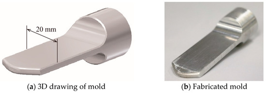 The fabricated mold for PI film molding is shown in Figure 7. The mold was made of duralumin and the complex shape was shaped using a machining center. An outline of the molding method is shown in Figure 8. The PI film was held and positioned in the fixture. There is a hole in the center of the fixture through which the mold passes. The mold was heated to a high temperature and pressed against the film to form a PI film into the designed shape.