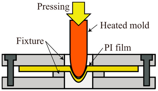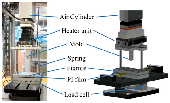 The molding machine is illustrated in Figure 9. The mold was attached to an air cylinder with a heater unit. A temperature sensor was installed in the heater unit and the mold was heated and controlled by using a heater unit. The air cylinder moves along a guide that determines the position of the fixture and presses the mold against the PI film. A limit is set by using a load cell and a spring to prevent the mold from being pushed beyond the designed amount.