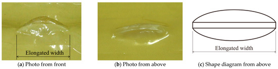 Photograph of molded pod structure on PI film and measured elongated width: (a) photograph from front; (b) photograph from above; (c) schematic diagram of molded shape from above.