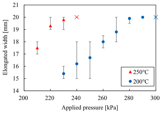 The molded PI film and the measured elongated width are shown in Figure 10. The target width was set to 20 mm to match the fabricated mold. The relationship between the molded width, temperature, and applied pressure is shown in Figure 11. By applying pressure in excess of a certain value, a width of 20 mm was obtained, confirming that the film was molded correctly. The higher the temperature, the softer the film becomes, indicating that the film can be molded at a lower pressure. By contrast, increasing the temperature caused the film to change its properties and tears were more likely to occur. At pressures above 290 kPa, the shape was molded beyond the range of the mold. In this study, the molding conditions were set to 200 °C and 280 kPa.