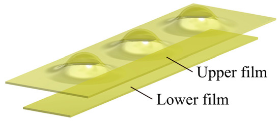 Many of these studies were based on the use of rubber molding or rubber tubing [12,13]. The expansion and deformation of the rubber chamber caused by the application of gas pressure is controlled by structural and mechanical constraints and is used as an actuator [14,15,16,17,18]. The McKibben-type artificial muscle using a fiber constraint is one of the most popular ones [19,20]. By contrast, a pneumatic film actuator uses a non-stretchable film. Film actuators are extremely lightweight owing to the thinness of their constituent materials. In the standby state where no gas is applied, most of the actuator will only be as thick as a laminated film. Therefore, robots and machine elements that can be easily stacked and transported are expected to be realized by using film actuators [21,22]. The actuator can also be permanently installed without taking up much space by wrapping it around something or tucking it into a crevice. For this reason, the demand for an inflatable structure such as a film actuator is increasing not only in the aforementioned application fields but also in fields such as space development where lightness and portability are very important [23,24]. Our research proposes a new concept of robotics that consists of only film-like actuators and structures. The concept is named “Filmotics”, which is a compound of the words film and robotics.