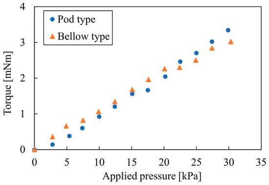 The relationship between the applied pressure and the torque generated by the actuators in the displacement-constrained state was evaluated. Figure 16 shows a schematic diagram of the measurement system and measurement. The actuator was fixed to the apparatus at the piping section and a force gauge was pushed 20 mm from the joint center where the force was generated. The torque was calculated by multiplying the measured force with the distance of the joint center from the measurement point. The relationship between the applied pressure and the generated torque is shown in Figure 17. From these experimental results, it was confirmed that two different actuator structures with equivalent performances could be fabricated.