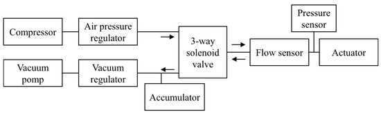 The durability of the two types of actuators was evaluated under repeated deformation. The durability was evaluated by the number of fracture cycles at the maximum deformation in accordance with the relationship between strain amplitude and the number of fracture cycles in general fatigue tests. A cylindrical chamber with no structure was also evaluated in the same manner to check the effect of the structure on durability. The diameter and length of the chamber were 8 mm and 40 mm, respectively. A system configuration diagram of the durability test is shown in Figure 18. A positive pressure of 30 kPa and a negative pressure of −30 kPa were switched by a solenoid valve and the actuator was repeatedly pressurized. The valve was switched after a period of time when the pressure and flow rate stabilized. The failure state was evaluated by measuring the leakage flow rate when a positive pressure was applied. In most cases, the actuator is used by a differential pressure between the positive pressure and open air (0 kPa). However, buckling, which is the cause of failure, does not occur every time under open-air conditions. Therefore, in order to accelerate the fatigue fracture, positive and negative pressures were applied repeatedly as a harder driving condition.