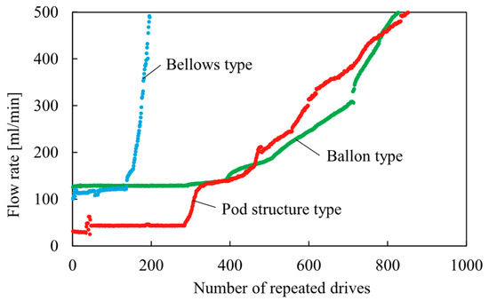 Relationship between the number of repetitive drives of each actuator and the flow rate.