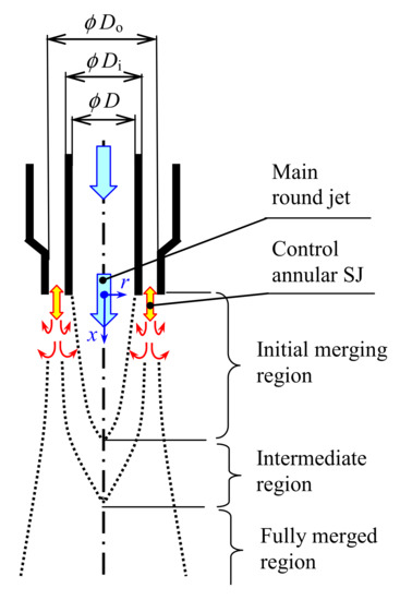 Diep and Sigurdson [21] used a coaxial arrangement with the main round jet and an annular control jet to model a smokestack with an actively controlled plume. A similar arrangement with an annular control jet was investigated by Koso and Kinoshita [22], and two different control mechanisms were distinguished. The first mechanism is induced by actuation by a very weak-magnitude oscillation where the jet spreading rate and the fluid mixing are enhanced, and thus, the velocity is reduced. The second mechanism is produced by a strong actuation, where the momentum of the main and control jets accumulates, and thus, the velocity is increased. In fact, both control jets [21,22] are synthetic jets in character.