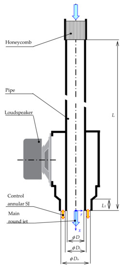 Lepičovský et al. [17] investigated high-speed round jets under strong upstream acoustic excitations (up to 141 dB) at Strouhal numbers of 0.4, 0.5, and 0.6. They found that the upstream acoustic excitation can enhance flow turbulence, jet spreading rate, and fluid mixing. The effects were significant at the end of the jet potential core due to a promoted generation of the large-scale structures. Similar results were found by Vlasov and Ginevski [16], who revealed that low-frequency acoustic excitations at Strouhal numbers in the range of 0.2–0.6 enhance flow turbulence, jet spreading rate, and fluid mixing through the promotion of large vortices. On the other hand, high frequency forcing at St = 2–5 reduced flow turbulence, jet spreading rate, and fluid mixing through the promotion of small vortices.