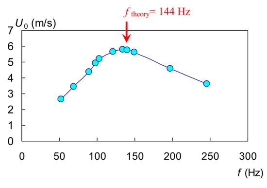 Figure 3 shows the velocity resonance curve as the dependence of the characteristic velocity on the driving frequency. The measurement was made for a constant real input power of P = 2.0 W ± 1%. The maximum U0 velocity was achieved approximately at 134 Hz.
