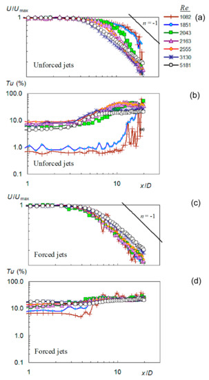 Axial velocity profiles of the selected unforced cases from Table 1 along the jet axis (r = 0) are shown in Figure 4a. The results are presented in the dimensionless form of U/Umax. With increasing Reynolds number from Re = 1082 to 5181, the jets undergo a transition from the laminar regime (Re = 1082–1851) to the turbulent regime (Re = 3130–5181). The jets with Re = 2043–2947 are the transitional ones. The region of the constant velocity indicates the potential core for x/D = 0–4. Farther downstream, the velocity decay is developed. For the laminar cases, the process is gradual, without a rapid turning point in the relationship. On the other hand, the turbulent cases show well distinguishable regions of the constant velocity (potential core for x/D < 4) and the exponential velocity decay with exponent approximately n = −1 for x/D > 4. The transitional cases represent the link between the laminar and turbulent behavior.