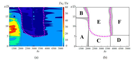 As expected, the control forcing impacts regimes of the main flow. For the given geometry and chosen parameters of the control SJ (cu = 0.5 and St = 0.3 for all experiments of this study), the local flow regime along the jet axis depends on two parameters: Re and x/D. Figure 5 shows a map of parameters related to the flow regimes. For each point along the jet axis, the Tuc/Tu ratio between the turbulent intensity in the forced and unforced cases was evaluated, and Figure 5a shows the dependency of Tuc/Tu on Re and x/D. Six flow regimes A–F were distinguished from Figure 5a; their basic parameters are listed in Table 2, and the occurrence of these regimes is presented in Figure 5b.