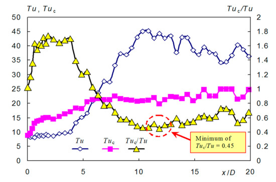 As the E flow regime with turbulence reduction by the flow control seems to be potentially interesting for subsequent investigations, a typical example of the development of the turbulence intensities is presented in Figure 6 for Re = 2555. Development of the Tuc/Tu ratio is plotted in Figure 6 as well, showing the minimum achieved ratio of Tuc/Tu = 0.45.