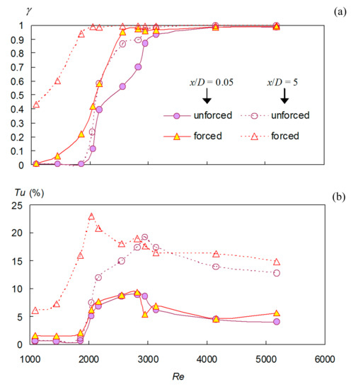 The factor was evaluated at the nozzle axis (r = 0), closely downstream of the nozzle exit (x = 0.5 mm), and at x/D = 5. The γ-factor for both unforced and forced jets near the nozzle exit is presented in Figure 7a. The intermittency factor remains nearly zero for the Re = 1082–1851 near the nozzle exit, then starts to increase and approaches the value of 1 at Re = 4151, indicating completion of the transitional process. The onset of the transition well agrees with profiles of axial and fluctuation velocity components shown in Figure 4a,b, where the beginning of the transition was also identified at Re = 2043. The forcing influences the γ−factor, the curve of γ is shifted practically equidistantly toward the lower Reynolds numbers. The transition begins at Re = 1445 and is finished with Re = 2820. It is worth noting that the annular SJ is not fully merged so near the nozzle exit; despite this fact, the forcing affects considerably the main jet from the moment the jet exits the nozzle. This can be attributed to the effect of an acoustic excitation caused by the forcing jet. The intermittency factor of the unforced jet remains almost unchanged at x/D = 5; a slight increase is achieved in the transitional cases. However, the forcing causes the increase in the γ-factor for all the cases. Three, initially laminar, jets change into the transitional ones, and all the transitional jets become turbulent by this distance. To complete the picture, Figure 7b shows the intensities of turbulence of unforced and forced jets at the same positions as in Figure 7a. In all cases, the maximum occurs within the end of the transitional region (cf. Figure 7a).
