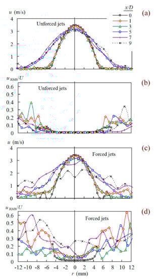 The effect of the forcing can be shown also on the transverse velocity profiles. Figure 8 shows the velocity and Tu profiles of the jet with Re = 1082 without forcing (Figure 8a,b) and with forcing (Figure 8c,d), respectively. In accord with the previous findings from Figure 3 and Figure 7, the initial velocity profile (x/D = 0) is typically laminar with a parabolic shape. The profiles remain almost unchanged up to x/D = 3. With increasing distance, the slight decrease in the axial velocity accompanied by the profiles’ widening can be seen in Figure 8a (see also Figure 4a). The level of turbulence intensity is low; see Figure 8b.