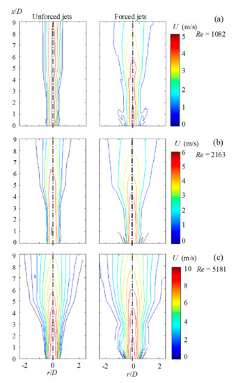 Figure 9b shows the velocity maps of the jet with Re = 2163, i.e., jet from the transition regime, unforced and forced cases. The same data processing was made for Re = 5181 (turbulent regime), and the results are shown in Figure 9c. The effect of forcing on the velocity map (shortening of the potential core, widening of the jet) is apparent in both Figure 9b,c; however, with increasing Reynolds number, it is less prominent than that of the initially laminar case (Figure 9a, Re = 1851).