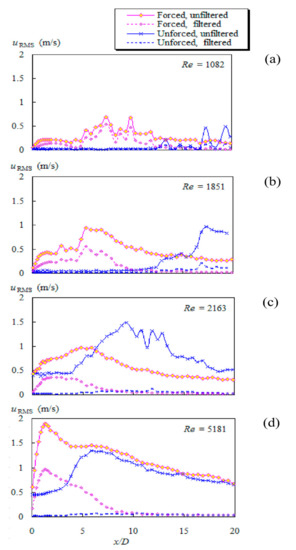 Following the approach of Crow and Champagne [5], the axial profiles of the velocity fluctuations of four selected forced cases (Re = 1082, 1851, 2163, and 5181) were filtered using Butterworth bandpass filter around the forcing frequency (St ≈ 0.3). The resultant filtered profiles are shown together with unfiltered profiles in Figure 10. For comparison purposes, profiles of the corresponding unforced jets are plotted as well. The influence of the forcing frequency is apparent mainly in the near nozzle-exit region where the large-scale eddies dominate.