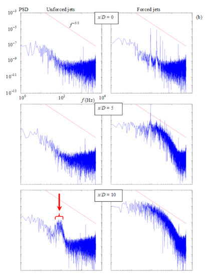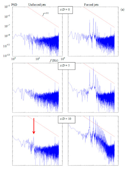 The spectra of transitional and turbulent forced jets do not differ much from the unforced ones (Figure 11c,d). The main difference is the presence of the discrete peaks of the forcing frequencies and their harmonics. In the transitional case shown in Figure 11c, the forcing causes a slight increase in the PSD level. In the turbulent case (Figure 11d), the overall level remains practically unchanged, and the PSD distribution well obeys the slope relating to Kolmogorov’s exponent −5/3.