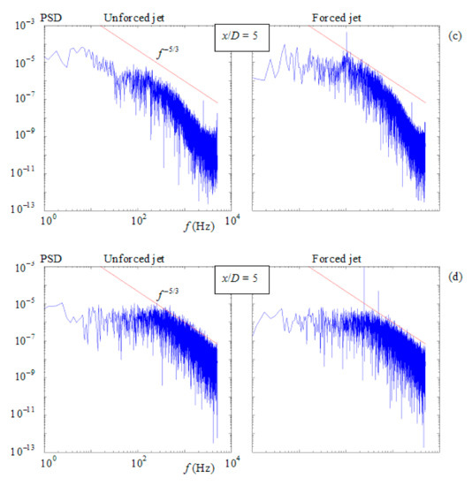 The turbulent unforced jet with Re = 5181 has already fully developed a cascade of energy transport at the distance of x/D = 5, which is indicated by the PSD distribution with the slope relating to the exponent −5/3; see Figure 11d. Similar to the case presented in Figure 11c, the dominant frequency cannot be identified in Figure 11d.