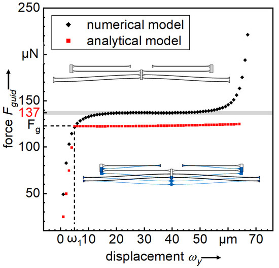 In the solid mechanics interface, the depth of the 2D component is set to 20 m. The six rounded shoulder fillets are tied to fixed constraints, and a prescribed displacement parameter in y-direction is set. The fine mesh comprises a minimal element size of 0.5 m, which is more than sufficient for the simulation. In the stationary study, the prescribed displacement parameter varies from 0 to 70 m by the step size of 1 m. Taking non-linearities in consideration, the reaction force in y-direction can be simulated. Figure 3 shows the simulation results of a spring system compared to the theoretical results. Both models are performed on the basis of the Young’s modulus in [110] direction of monocrystalline silicon and the Poisson’s ratio is neglected for simplicity. The chart shows that there are differences between the numerical and analytical constant-force of approximately . This factor may partly be explained by the rounded shoulder fillets of the simulated non-linear spring system to protect the beams from breaking at the clamping. However, the final design of the springs is manually optimized by varying the parameters of the component geometry. In further work, the Nelder-Mead algorithm or the multilevel coordinate search [17] can be used for systematic non-linear optimization.