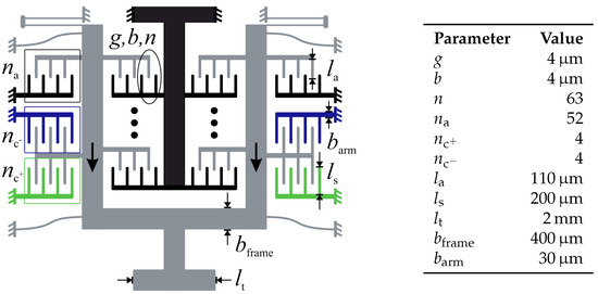 As Figure 1 demonstrates, the actuator consists of two electrically conductive combs. One comb is mechanically fixed while the other is suspended on an elastic suspension spring. Detailed analytical descriptions of comb drives can be found in References [8,11]. The design of the suspension spring is essential in order to eliminate unwarranted angular motion of the rotor [12]. It is designed to have a low stiffness parallel to the comb fingers and a much higher stiffness in the transverse direction. The formula for the capacitance of the comb drive is given by