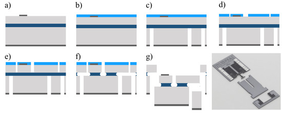 The demonstrators are fabricated using a SOI-based dicing free process known from, e.g., References [9,18]. The main processing steps are shown in Figure 5. A (100)-oriented SOI substrate with 20 m thick device layer and handle layer of 400 m thickness is used. First, a 100 nm thick aluminium layer is deposited on the handle and device layer by evaporation. On the device layer, the aluminium serves as electrode material and is patterned by wet chemical etching (a). In a second step, a hard mask is deposited by PECVD (b). For the release of the chips from the substrate, the aluminium on the handle layer is patterned by wet etching and then etched using deep reactive ion etching (c). In a second deep etching step (e), the mechanical structures on the device layer are etched subsequently after the patterning of the hard mask (d). Next, an HF-vapor process is used to release the mechanical structures by etching the underneath the moveable structures (f). In this processing step, the chips, as well as the backside, are also released from the wafer without dicing (g). Finally, the protection structure for the measurement tip is severed at the predetermined breaking point.