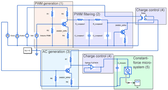 Excitation circuit for the reliable deflection of an electrostatic constant-force microsystem with PWM generation (1), PWM filtering (2), AC generation (3), the charge control components (4), and the constant-force microsystem (5) displayed by its capacitance.