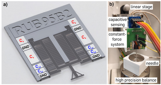 The completed microchip is glued onto a printed circuit board (PCB) with a carbon conductive paste for the electrical connection of the microsystem. The aluminium bondpads on the chip in Figure 7a were connected to the contacts on the PCB by bonding with aluminium wire. The handle layer and the moveable parts on the chip are connected to ground for the electric protection of the measured sample. The non-moveable electrostatic combs of the actuation comb drive () are connected to the input voltage on the PCB. For the differential capacitance measurement, the four sensor pads , , , and were connected separately onto the PCB. The PCB includes pin headers for the electrical connection to voltage control and the capacitive sensing chip on a separate board. This allows for an easy exchange of the constant-force actuators, since all actuators can be controlled with the same electronics.