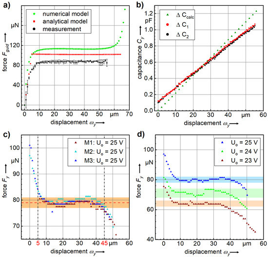 Figure 8c shows the results of three measurements of the constant-force system with electrostatic actuation. For the operating voltage , the arduino program was set to , which leads to a voltage drop of 0.6 V due to the high low pass resistors of 2 M. The constant-force range can be found between m and 45 m with a force of N. The corresponding simulated constant-force range of 40 m (Figure 3) is confirmed in Figure 8c. Finally, Figure 8d illustrates the force measurement at different operating voltages, and Table 1 includes the measurement results.