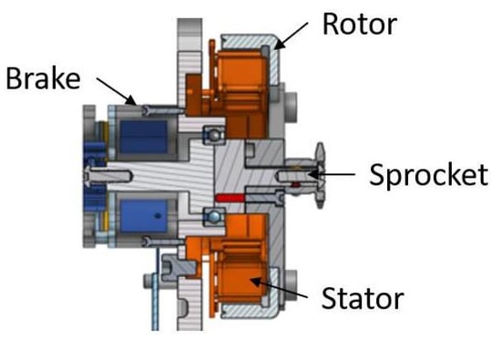 The two units had comparable dimensions and overall designs (Figure 1). An ANSI size 25 roller chain connected the motor/brake unit to the transmission. Each actuator was the same size (231.8 mm long, 108 mm wide, and 76.7 mm deep) and mass (2.1 kg), and was small/light enough to be considered for biomedical exoskeleton applications. 50:1 overall gearing was targeted for each design—at 28.8 V (system voltage used in prior work []), the motor would spin at 3860 RPM without any load, and 463 deg/sec. output after the 50:1 reduction. Even accounting for unknown inefficiencies, this is higher than necessary for walking at speeds necessary for community ambulation.