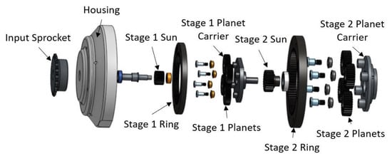 Harmonic drives and planetary gears are the focus of this study due to their ability to provide substantial gearing reduction within a compact form factor. Planetary gear mechanisms consist of three primary components—the internal sun gear, the external ring gear, and intermediate planet gears and their carrier []. In its simplest form, a constant gear ratio is formed by fixing one of these components, treating one as an input, and one as an output. For maximum gear reduction, the ring gear is fixed, the sun gear is treated as the input, and the planet carrier is treated as output. Dividing the input torque load amongst multiple planet gears allows for a smaller size compared to a single spur gear mesh of equivalent torque/gear ratio. Multiple stages can be implemented concentrically for greater reduction in a compact package.