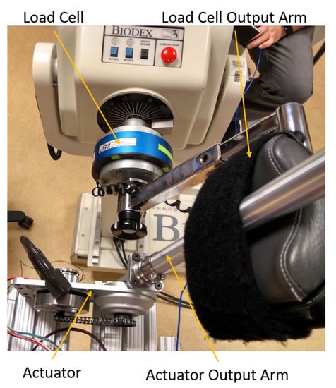 Isometric torque is defined as the relationship between output torque and motor current at zero speed. Prior research established this relationship for electromechanical actuators to be linear [,]—the bench testing was performed to determine the slope (isometric torque constant, expressed as Nm per A) of that line. To determine this constant, the output arm of the actuator was attached to a load cell (JR3) that was fixed in place (Figure 4). Resultant torque was measured for a sequence of applied currents ranging from one to eight Amps, in one Amp increments. Each current command was issued for three seconds. Motor current and output torque were collected at 100 Hz. Torque data was only considered at steady state—early transient data in the three second period were discarded.