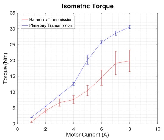 Isometric torque results are shown in Figure 5. The actuator with the planetary transmission generated significantly higher torque for a given current for all tested currents. On average, the planetary gearbox produced 3.39 Nm/A of commanded current, compared to 2.07 Nm/A for the harmonic gearbox. At maximum current (15 A), the planetary gearbox is capable of 50.9 Nm torque, compared to 31.1 Nm for the harmonic gearbox (extrapolated from testing results).