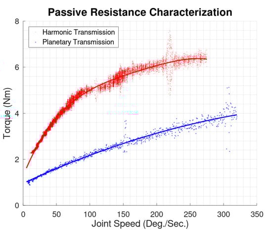 Test results for passive resistance are shown in Figure 6, along with best fit trend lines. Each point represents a data point taken during the current command sweep—measured motor current and measured joint velocity (derived from measured motor speed divided by actuator gear ratio) are shown in the plot. These equations are summarized below. In testing, the harmonic actuator did not achieve the same maximum output angular velocity as the planetary actuator. The planetary actuator testing was stopped at 330 deg/sec, the maximum design specification. The harmonic actuator test was stopped at 270 deg/sec due to excessive chain vibration which eventually resulted in the chain coming free of the sprocket. There were two sources of noise in this data. The first was from the closed loop current controller used for this test—the PI parameters in the controller were tuned when the actuator was loaded with significantly more inertia. When the output arm was removed for this test, these higher than optimal parameters resulted in noisier current commands. The areas of higher dispersion in the data indicate the resonant frequencies of the actuator—temporarily creating higher than normal levels of vibration as the speed swept through that point. The best fit trend line showed decreasing passive resistance at high speed. Prior testing of harmonic drives showed that passive resistance may not monotonically increase with speed [].