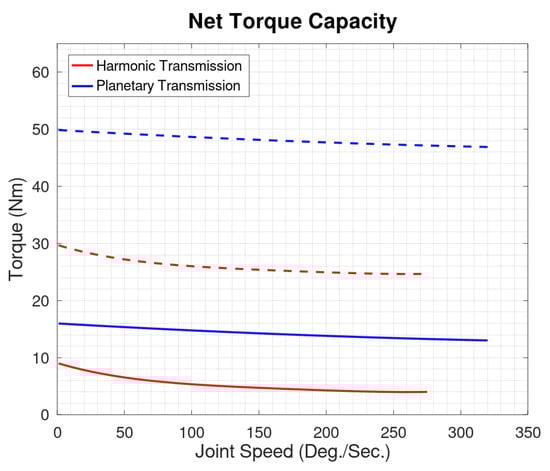 This work directly compared two transmissions that could be integrated into a hybrid exoskeleton. Aside from the transmissions, the rest of each actuator was designed to be as similar as possible—incorporating the same motor and brake components, and similar transmission ratios. Both actuators were implemented with the same form factor and had similar size and mass. A tightly integrated motor/brake was built into both designs. With this ability to lock, these actuators were also suitable for users with spinal cord injury who require full exoskeletal support during stance. The information presented here will allow for more informed future design criteria. The design objective was maximizing torque for a given required design speed. Future testing of a complete exoskeleton platform will reveal what joint torque is actually required to facilitate high speed hybrid gait. From this testing, it is clear the planetary transmission is the superior transmission—isometric torque increased by 38% while passive resistance decreased by approximately 30% across all joint speeds compared to the harmonic transmission. These two results combined to show a significant increase in peak and continuous output torque for the planetary transmission.