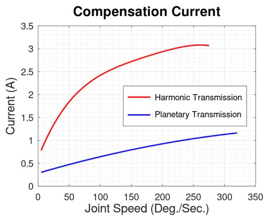 Figure 8 shows this compensation current based on the passive resistance model for both actuator configurations. Across all joint speeds, the decreased passive resistance of the planetary actuator results in roughly 2/3 less current needed to compensate for it. This result also decreases overall power consumption of the actuator, resulting in either a decrease in needed battery size and/or capacity or an increase in endurance. This comparison demonstrates potential for decreased current consumption in practice of the planetary actuator compared to the harmonic. More care would need to be applied in the implementation phase (and potentially additional variables added to the model).