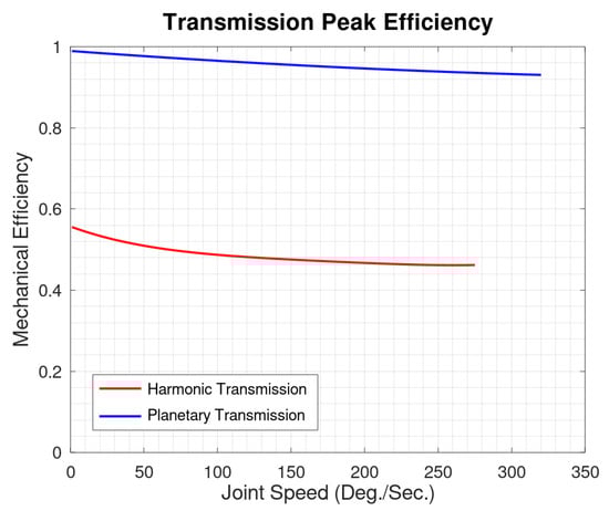 The results of the mechanical efficiency calculation are shown in Figure 9. Efficiency, as derived in Section 2.3.4 is a function of both motor current and joint speed. The figure shows peak (greatest) efficiency as a function of joint speed, which occurs as the greatest motor current of 15 A. The significant increase in isometric torque for the planetary actuator manifested as a significant increase the mechanical efficiency. The decreased passive resistance of the planetary actuator translated to less significant efficiency fall off with increasing joint speed. Overall, the planetary actuator approximately doubled the mechanical efficiency of the harmonic actuator.