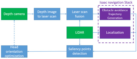 As illustrated in Figure 2, the proposed navigation stack consists of the following components: the Depth image to laser scan, Laser scan fusion, the Isaac Navigation module (from NVIDIA [24]) which performs localization and obstacle avoidance, Saliency points detection, and Head orientation optimization.