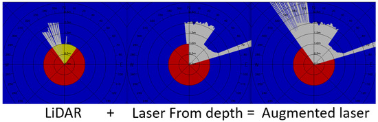 The laser scan fusion module merges the scans from the 2D LiDAR sensor with the synthetic scan from the point-cloud and returns an augmented laser scan in the desired reference frame. As we can see in Figure 3, the augmented laser scan is the result of the union between the two input readings; for the same angular coordinate, the laser with the smaller radial distance is taken as value. Figure 3 shows that the laser fusion extends the actual FOV of the LiDAR, when the head of the robot is oriented towards the right or the left (i.e., when the head angle is larger or smaller than ±∣∣.