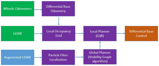 In the proposed approach the navigation system uses as input the robot’s odometry, the real LiDAR scans and the augmented laser scans to compute the local trajectory, the global path and the speed of the wheels. A particle filter provides localization in a similar fashion to the Montecarlo localization algorithm [25], a global planner provides the reference path according to the visibility graph algorithm [26]. To generate the local trajectory a Linear Quadratic Regulator (LQR) planner is used, based on the model of a differential drive robot.