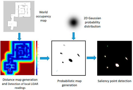 Detection of uncertainty points not belonging to the global map: Since the global path planner already takes into account the obstacles in the global occupancy gridmap, we are only interested in looking at salient points that are not included in the global map but that are only detected in real time. Local obstacles differ from the global map for two main reasons. First, the local map is generated with real time LiDAR readings and thus takes into account new or re-located obstacles in the environment. Second, the global map is often edited in post-processing to correct possible mapping errors or to open missing passages (e.g., a door that was closed during mapping).