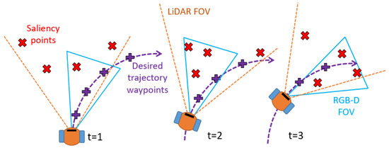 The objective of the optimization is to calculate the trajectory of the head that maximizes the sum of the weights of the relevant points (trajectory way-points and obstacle candidates points) that enters into the camera’s FOV (Figure 7).